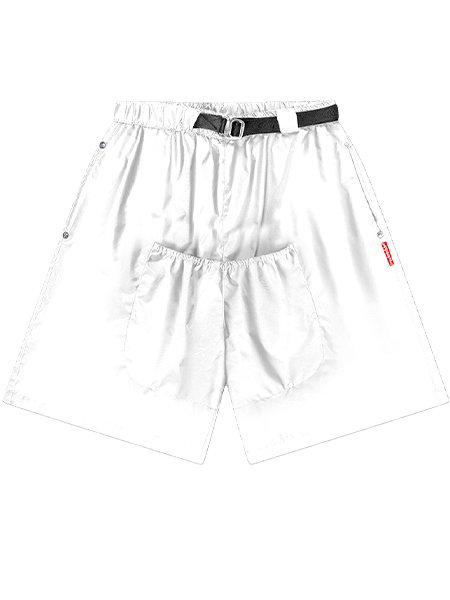 Bermuda Balão clássica, em tecido branco, com dois bolsos frontais com elástico e reforçados com rebite, dois bolsos laterais tipo faca e um bolso redondo com elástico na parte de trás.