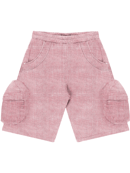| Bermuda Cargo leve, em tecido xadrez brilhante, com dois bolsos frontais reforçados com rebite, dois bolsos cargo redondos com zíper nas laterais como nos modelos da Mad 2023-3 e 2023-4, e dois bolsos traseiros com lapela. Cós com cinto e ajuste metálico Mad e duas etiquetas de couro ícone M nas costas. |