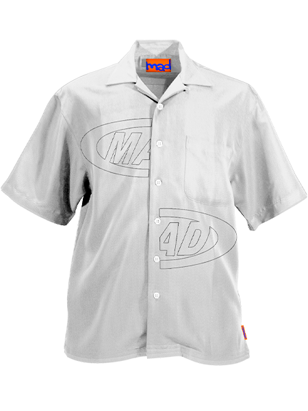 Camisa de botão, manga curta com gola cubana e bordado “Portal Mad” sobreposto no mesmo tecido de camisaria. 6 botões e 1 reserva junto á etiqueta interna. Um bolso comum no lado esquerdo.