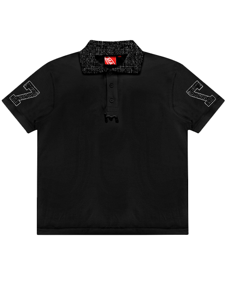 Camiseta Polo manga curta com bordado ícone M na frente, 3 botões, gola polo com tecido brilhante fio lurex e bordado “77” nas mangas com o mesmo tecido brilhante da gola.